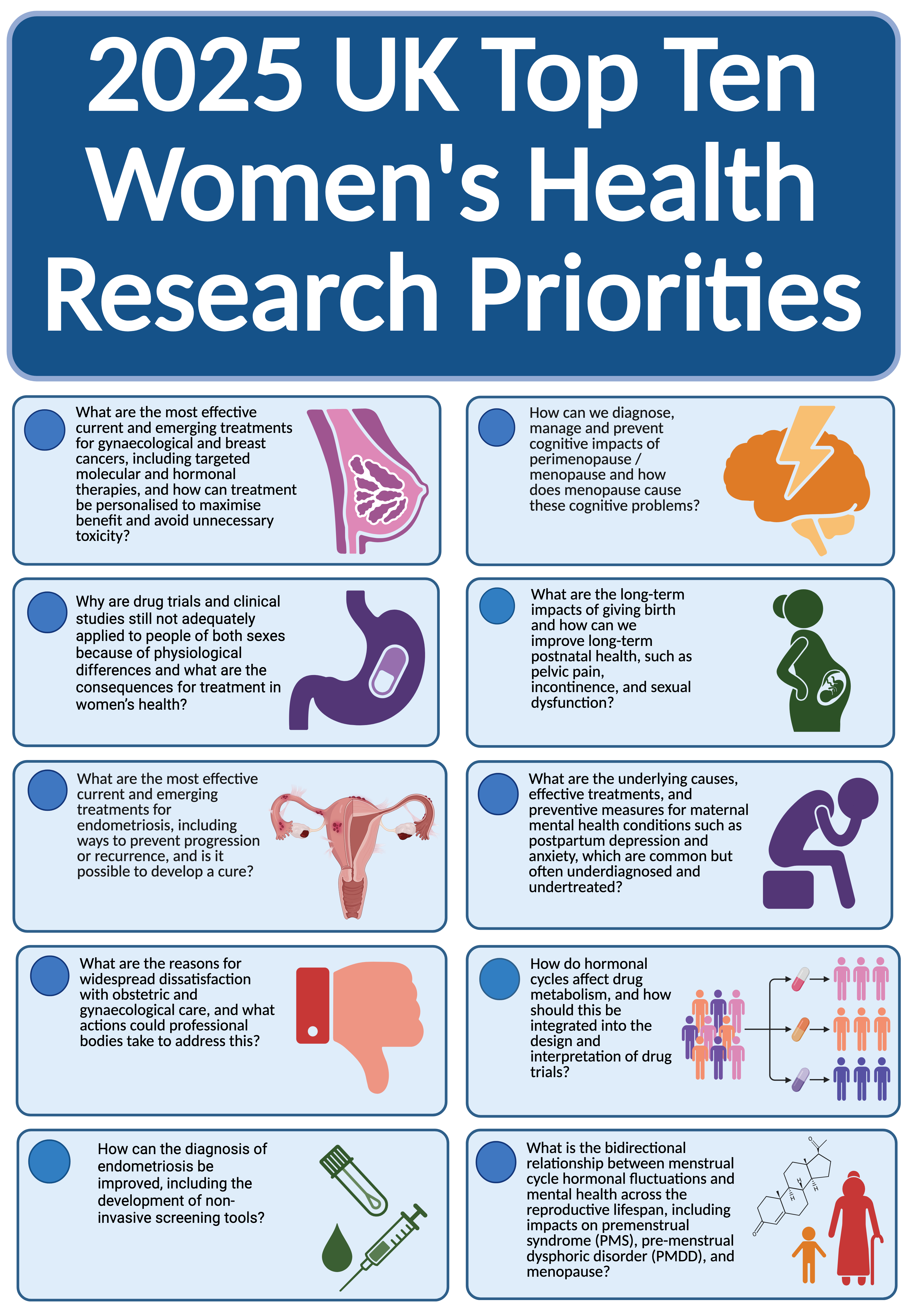 Read the project report or view the summary infographic to discover the top 10 priorities identified for future research into women's health.